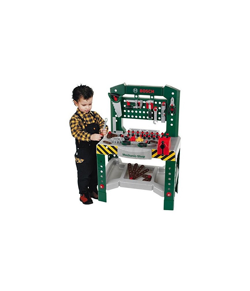 Bosch pracovný stôl ktorý poteší nielen malých domácich majstrov ale je schopný maximálne uspokojiť najvyššie nároky aj malých profesionálov. Tento veľký pracovný stôl poskytuje komplexné remeselné náradie a zverák, kľúč, skrutkovač, kladivo, píla, kliešte, skrutky a ďalšie príslušenstvo. Výška pracovnej plochy je cca 47 cm, preto v malej dielni budú vedieť malé deti pohodlne pracovať. Pod pracovnou plochou je úložný priestor pre drobnosti alebo veci, ktoré treba opraviť. Je v krásnom dizajne Bosch a ani trochu nezaostáva za ockovým ozajstným pracovným stolom v garáži . Opravy a prestavby môžu začať! S touto pracovnou sadou si malý chlapci užijú kopu dobrej zábavy!