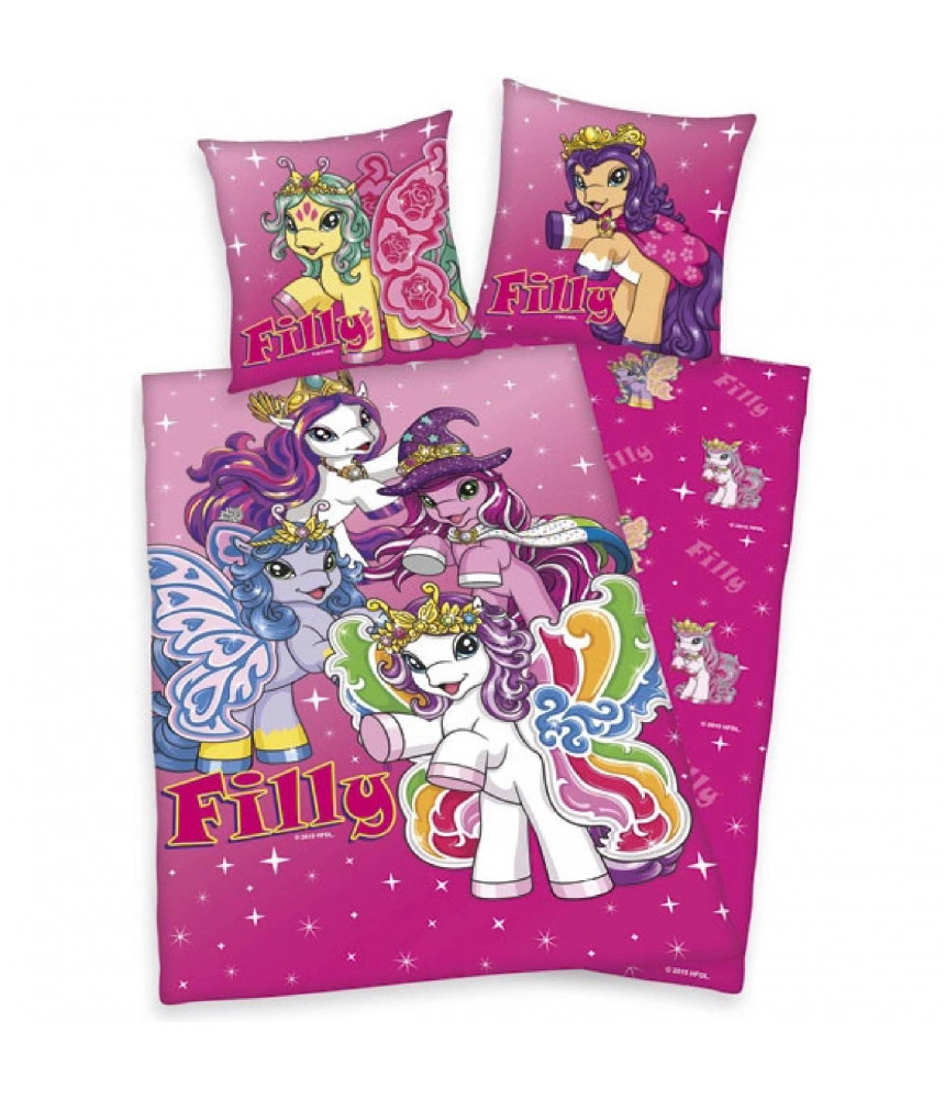 Obliečky Poník Filly v ružovej farbe. Detské bavlnené obliečky s poníkom Filly v jasných a ostrých farbách. Detské obliečky s Poniky je z materiálu 100% bavlna. Rozmer: 1x 140/200, 1x 70/90 cm. Zapínanie na zips.
