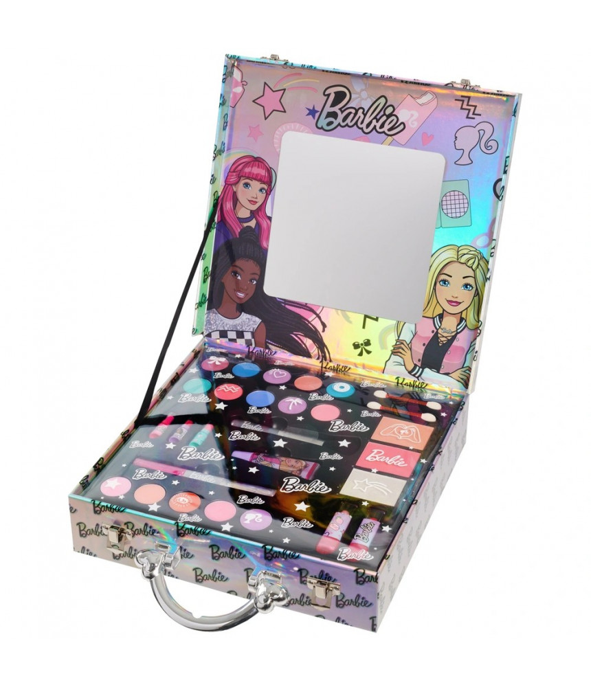 Sada obsahuje očné tiene v 10 farbách a 2 aplikátory; obsahuje tiež 3 odtiene lícenky, rozjasňovač a štetec na lícenku. Na pery obsahuje kozmetická sada 3 mini rúže, 2 rúže v plnej veľkosti a rôzne tuby lesku na pery. S toľkými krásnymi farbami nie je dôvod, prečo by ste nemali žiariť a žiariť – rovnako ako Barbie.