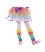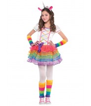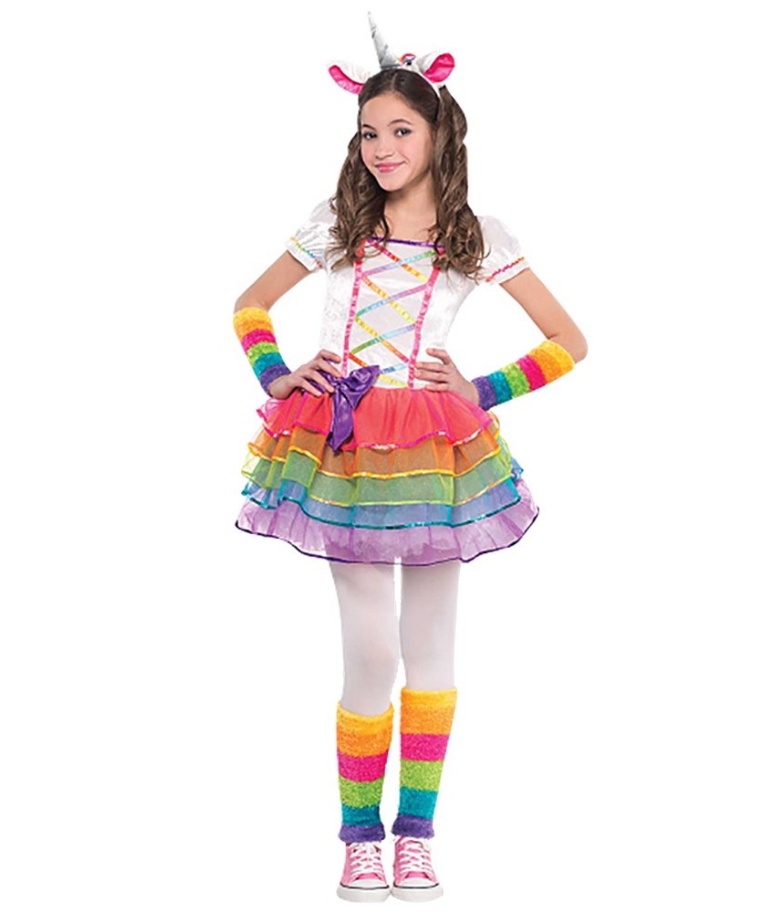 Očarujúcí kostým jednorožca. Staň sa aj ty krásným jednorožcom a pričaruj si rozprávkový svet. Kostým dúhového jednorožca pre dievčatá obsahuje farebné šaty s mriežkovou dúhovou stuhou na bielom vrchu a pripevneným chvostom, čelenku, ohrievače ramien a ohrievače na nohy.